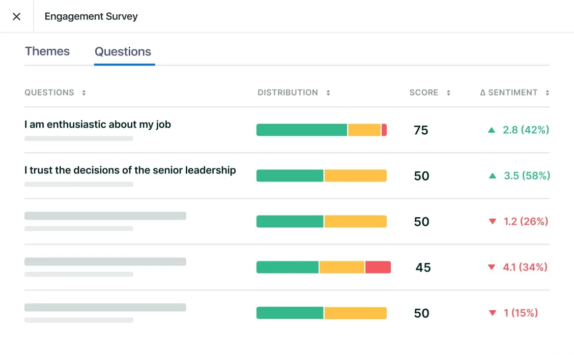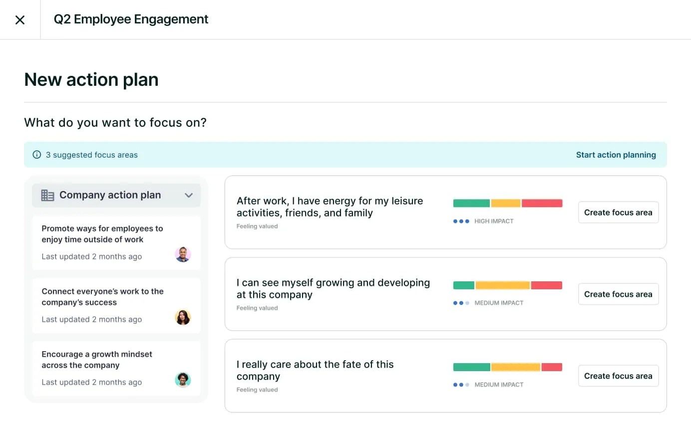 With collaborative action plans, research-backed suggested actions, and real-time results tracking, you’ll continuously improve the employee experience and drive strong cultural outcomes.