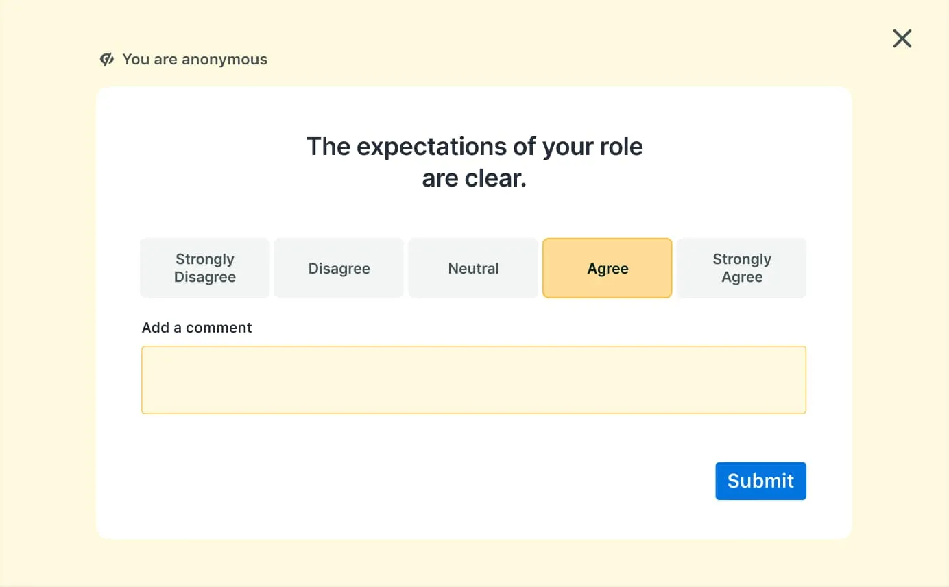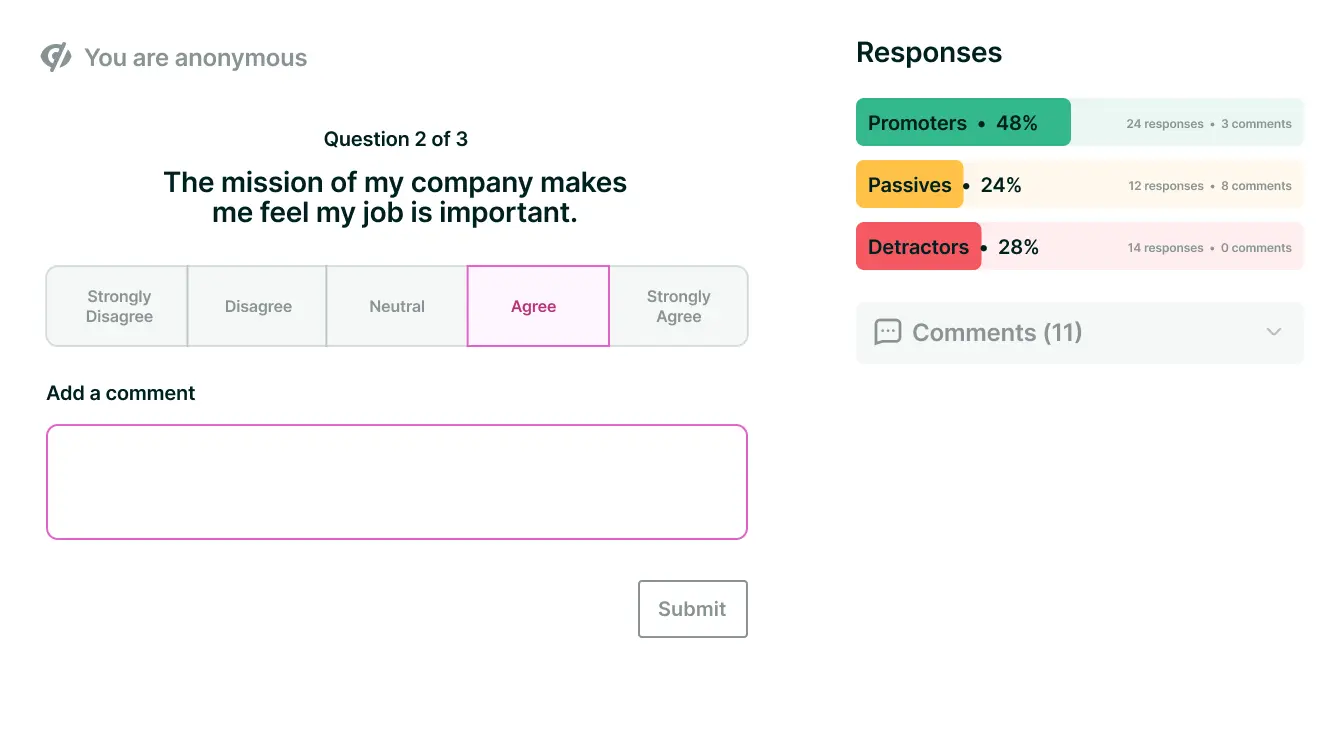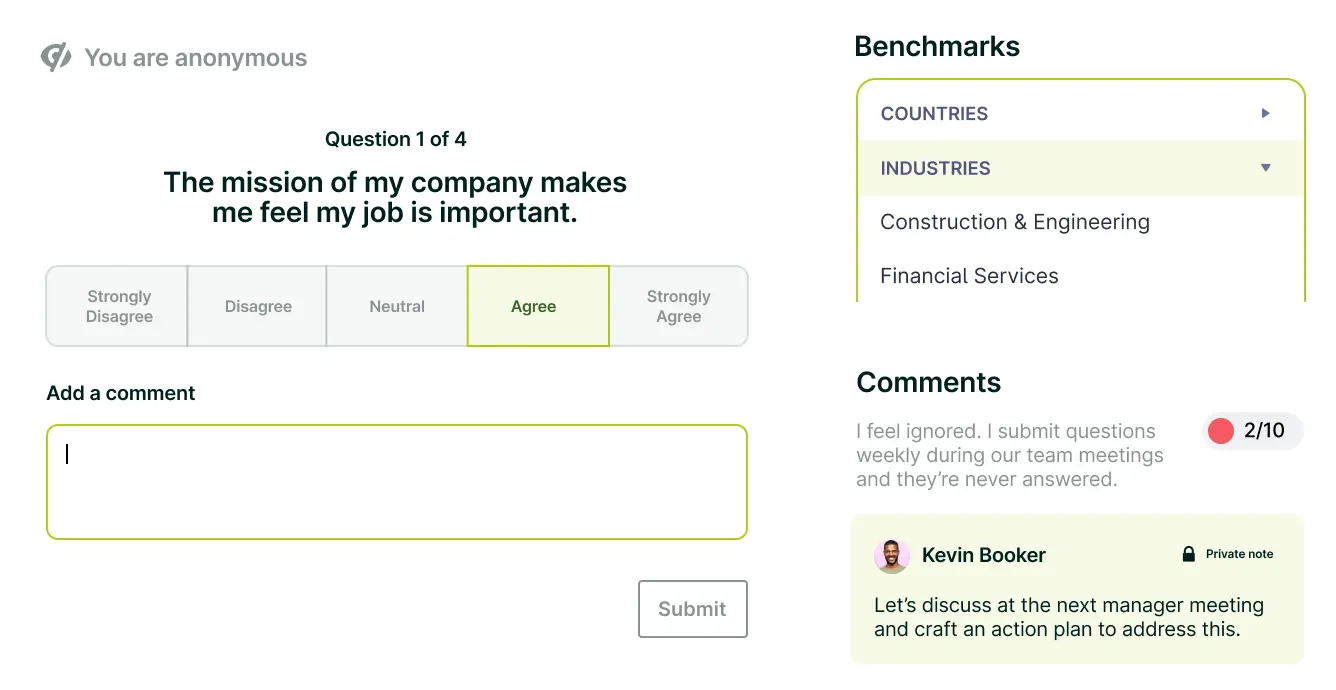 Work together with managers to respond to engagement survey feedback. Uncover great ideas, learn about your employees’ views, or address issues directly — give employees anonymity so they can share their honest opinions.