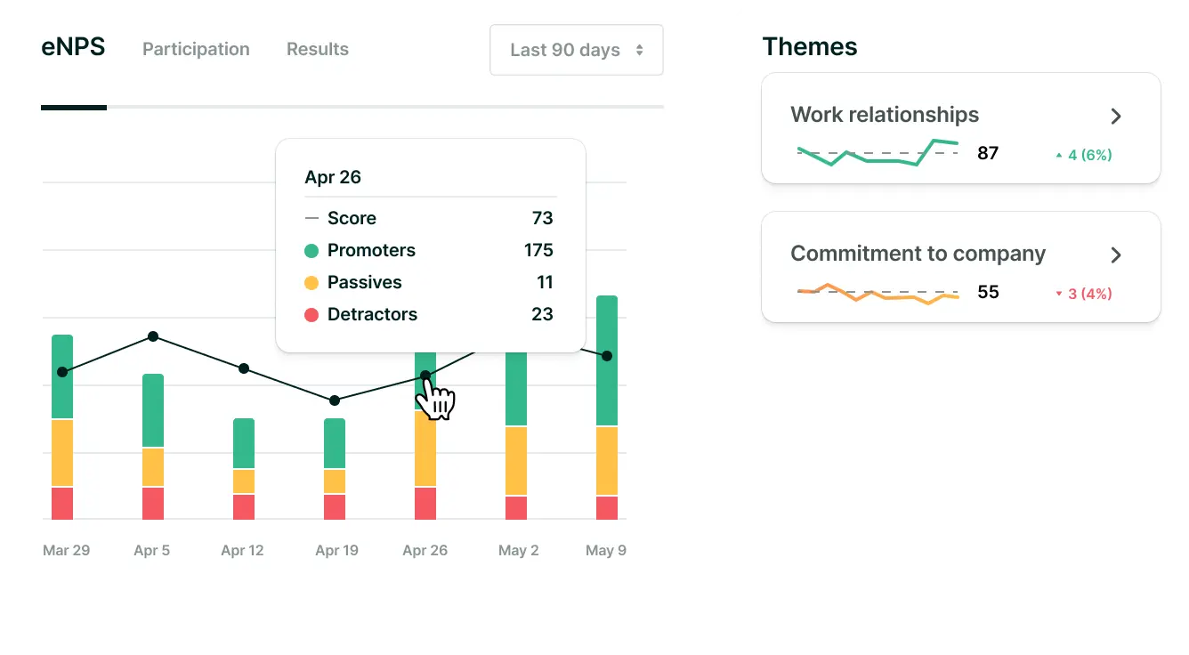 Continuously measure your company’s employee experience with Employee Net Promoter Score®, and quickly identify sentiment with one question.