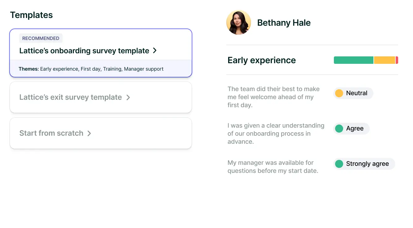 Lattice supports pulse surveys, eNPS, onboarding, offboarding, and exit surveys. HR teams can also create custom surveys to address specific needs, such as retention analysis or post-event feedback.