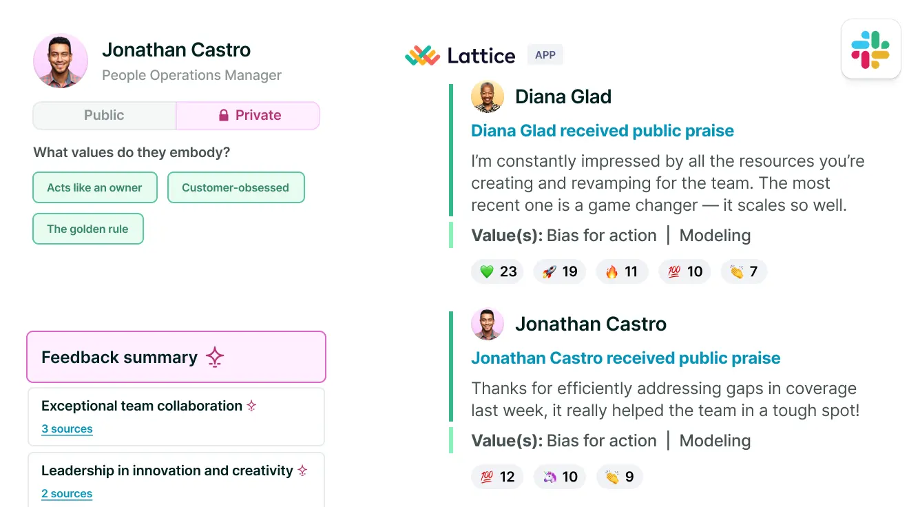 Lattice's platform includes tools for real-time feedback and praise, allowing your employees to share and receive feedback seamlessly. This fosters a culture of continuous improvement and open communication within your organization.