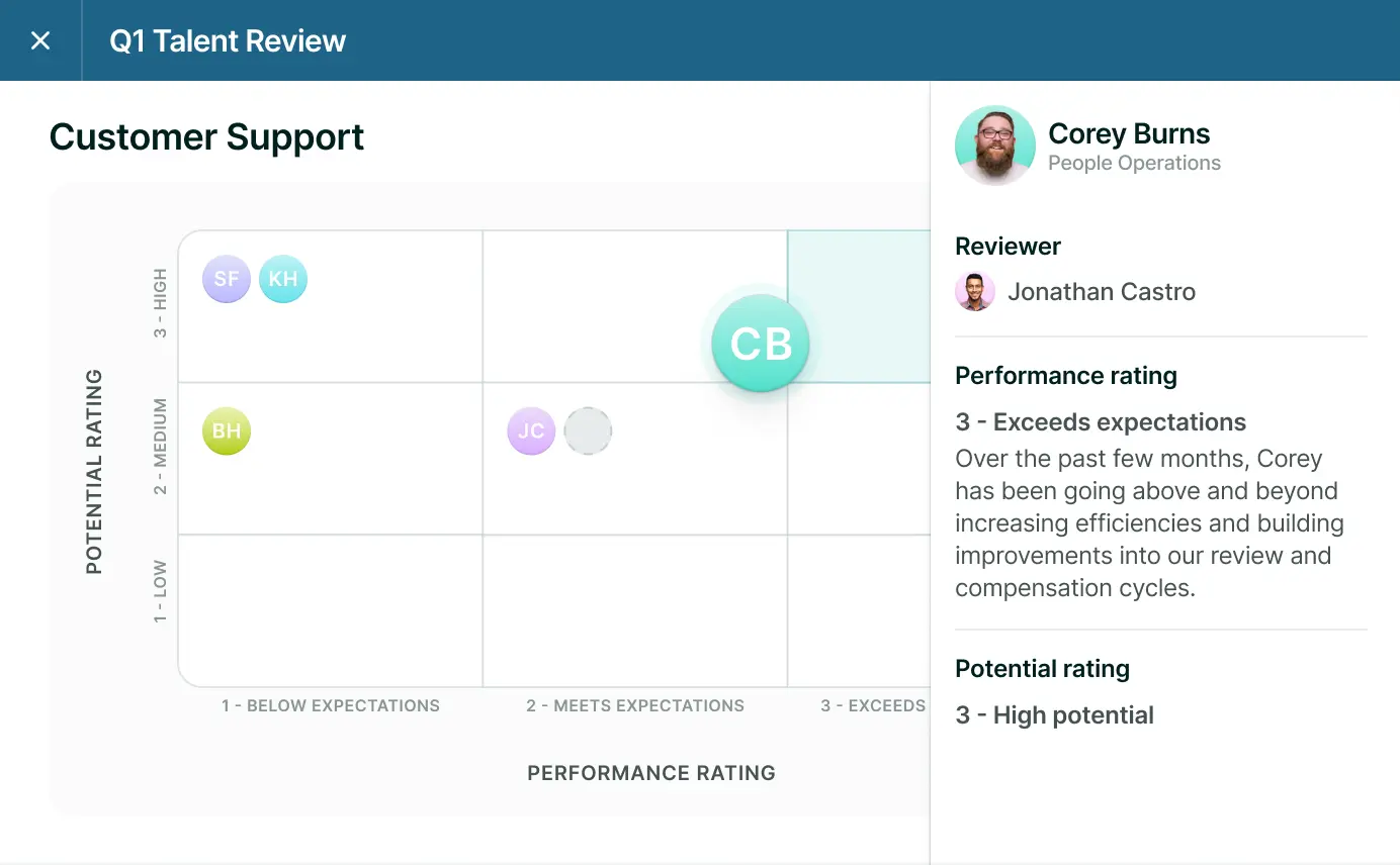 The 9-box grid is a tool within Lattice's talent reviews that plots employees based on their performance and potential. This helps organizations visualize and identify top talent, recognize areas for development, and make informed decisions regarding promotions and succession planning.