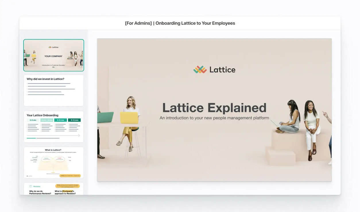 After serving thousands of customers, our team has learned the best practices for onboarding new teams onto Lattice. We designed these assets to make onboarding your team streamlined and painless.